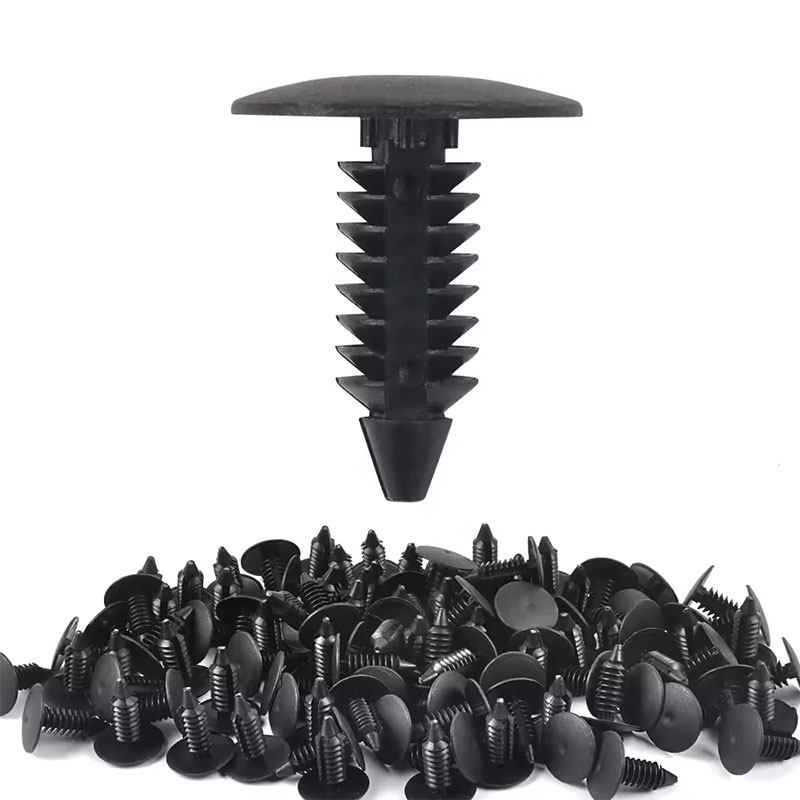 Qeepei Auto Co.'s Car Wheel Arch Fender Inder Foring Nitter Clips er vigtige fastgørelseselementer designet til sikkert at fastgøre den indvendige foring af dit køretøjs hjulkasseskærm, hvilket sikrer en tæt og varig pasform, der bibeholder både den strukturelle integritet og den æstetiske tiltrækning af din bils undervogn. Disse clips er fremstillet af sort plast af høj kvalitet og er konstrueret til at modstå de barske forhold under motorhjelmen, inklusive temperatursvingninger, fugt og vejaffald. Toppen af hver klips har et skruehoved, der muliggør nem montering ved at skrue det ind i køretøjets karrosseri, mens den unikke spiralformede skrue i bunden giver et stærkt greb om skærmbeklædningen, hvilket forhindrer den i at løsne sig eller vibrere under kørsel . Qeepei Auto Co. står ved kvaliteten af disse nitterclips og tilbyder en pålidelig løsning til at holde dit køretøjs hjulkasser i perfekt stand og sikre, at din bil fortsætter med at se ud og yde sit bedste.