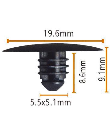 Toppen af denne skrue er designet til at være flad med en diameter på 19,6 mm og en længde på 8,6 mm, hvilket sikrer en tæt pasform med alle dele af køretøjet. Den hævede del i midten er 5,5 mm i diameter og 5,1 mm i højden. Dette unikke design forbedrer ikke kun stramningseffekten af skruen, men gør også installationsprocessen glattere. Bunden er en flad rund base med en diameter på 9,1 mm, hvilket giver en stabil støtte til skruen. Den samlede størrelse er tydeligt markeret, hvilket er praktisk for dig at hurtigt identificere og vælge, når du bruger.