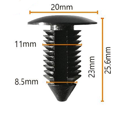 Den samlede længde af fastgørelsesorganet er 25,6 mm, bredden er 20 mm og hovedhøjden er 11 mm.